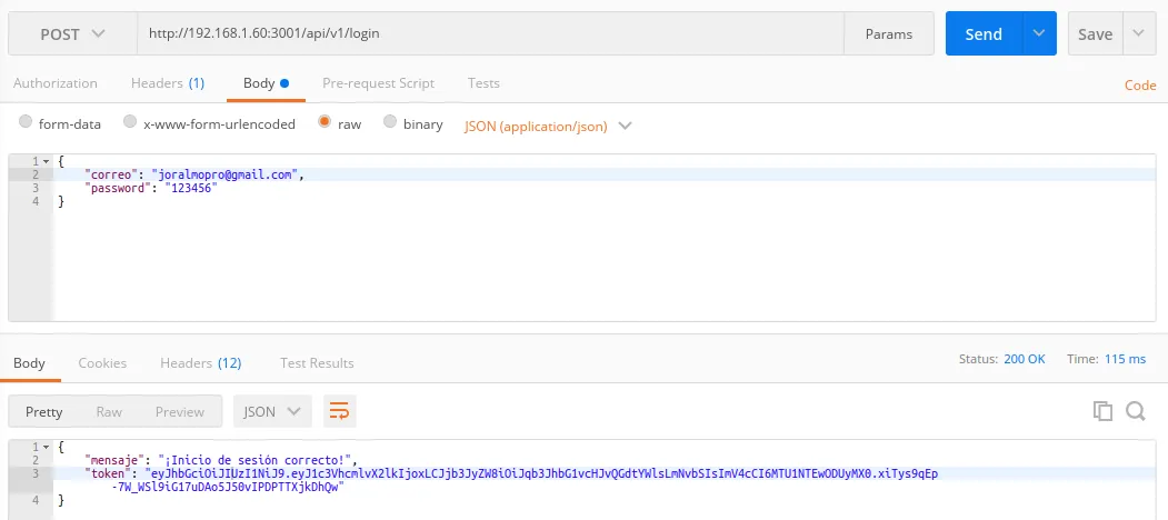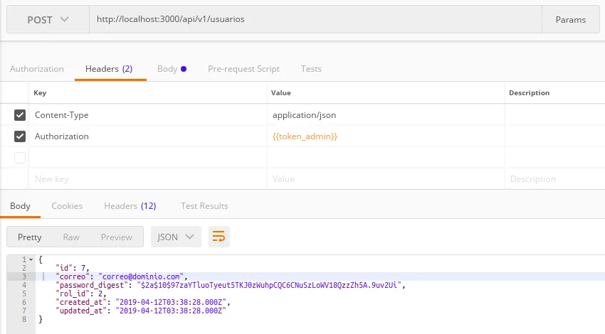 y luego para poder probar, ruby espera un csrf_token en cada solicitud pero aquí no lo utilizaremos por lo que nos toca deshabilitarlo agregando en application_controller protect_from_forgery with: :null_session y ahora si podremos probar (en mi caso lo haré con postman y enviando el usuario que he creado en el seed como admin)